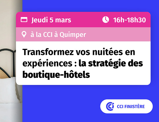 La CCI propose une table-ronde sur le thème du storytelling et des Boutique-Hôtels le jeudi 5 mars 2026 de 16h à 18h30 à la CCI de Quimper.