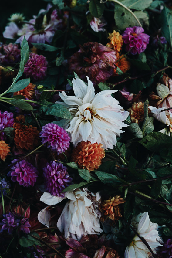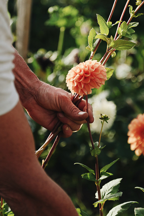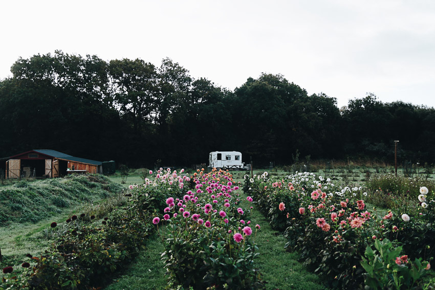 Ma production va de la graine à la graine et je m’attache à cultiver des fleurs de saison, joliment imparfaites. En ce moment je travaille tulipes, narcisses, anémones et renoncules, mais aussi les fleurs annuelles comme les cosmos, les immortelles et les tournesols. Je consacre une grande partie de champ aux dahlias (une cinquantaine de variétés) qui offrent une belle diversité de couleurs, de formes et sont parfaites pour composer des bouquets.